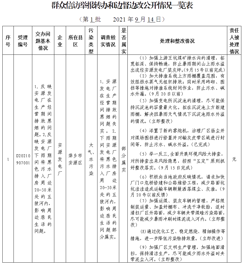 關于省環(huán)保督察信訪件反映安源電廠有關問題公示