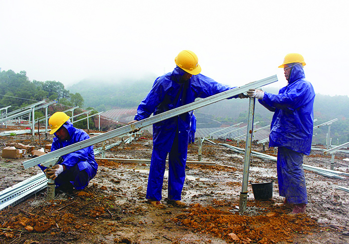 “坡度不夠,前立柱再抬高5公分,再高點(diǎn)……”日前,記者來到集團(tuán)公司光伏發(fā)電項(xiàng)目山頂施工現(xiàn)場(chǎng),只見工人們以三人為一小組,正冒雨校對(duì)支架坡度。放眼遠(yuǎn)眺,山腳平地間,有的工人正在攪拌水泥砂漿,有的正往山頂背送檁條……施工現(xiàn)場(chǎng)一片繁忙。 該項(xiàng)目是集團(tuán)公司轉(zhuǎn)型發(fā)展的重點(diǎn)項(xiàng)目,規(guī)劃占地總面積為560畝,投資1.67億元,規(guī)劃容量為20兆瓦,共安裝270瓦太陽(yáng)能光伏組件74660塊,年均上網(wǎng)發(fā)電量為1855.32萬(wàn)度,并經(jīng)35KV升壓站接入國(guó)網(wǎng)萍鄉(xiāng)電網(wǎng)。 “要想能源采集效率最大化,先要確認(rèn)支架坡度的準(zhǔn)確性,且確保太陽(yáng)能板與地面距離不低于300mm,并保證每組太陽(yáng)能板處于同一水平線上!表(xiàng)目相關(guān)負(fù)責(zé)人告訴記者,目前已完成基礎(chǔ)澆筑等工作,正在蹄疾步穩(wěn)地安裝檁條及鋪設(shè)太陽(yáng)能板。此外綜合樓內(nèi)部裝修、電纜敷設(shè)連接及外圍線路建設(shè)等電氣施工也正在同步進(jìn)行,預(yù)計(jì)11月底可基本完工。 “今天將近200名工人做事,從6點(diǎn)30準(zhǔn)時(shí)開工,可能晚上要加班到10點(diǎn)——你看,四周都裝有照明燈,夜間能夠照亮整個(gè)施工現(xiàn)場(chǎng)!表(xiàng)目相關(guān)負(fù)責(zé)人表示,為了確保工程如期竣工,力爭(zhēng)12月實(shí)現(xiàn)并網(wǎng)發(fā)電,在保障工人們安全的前提下,除了風(fēng)雨兼程保施工之外,還得挑燈夜戰(zhàn)趕進(jìn)度,爭(zhēng)分奪秒搶工期。 時(shí)間緊,工序雜,任務(wù)重。為此,集團(tuán)公司還專門成立了項(xiàng)目領(lǐng)導(dǎo)小組,開展轉(zhuǎn)型落地項(xiàng)目重點(diǎn)攻關(guān);制定了管理人員駐點(diǎn)督導(dǎo)制,項(xiàng)目相關(guān)負(fù)責(zé)人每天蹲守現(xiàn)場(chǎng)進(jìn)行監(jiān)管、協(xié)調(diào),積極落實(shí)主體責(zé)任;完善了考核倒逼機(jī)制,不僅倒排工期制定工程進(jìn)度時(shí)間表,相關(guān)負(fù)責(zé)人還繳納項(xiàng)目保證金和簽訂責(zé)任狀,并對(duì)照項(xiàng)目工期完成進(jìn)度嚴(yán)格考核。