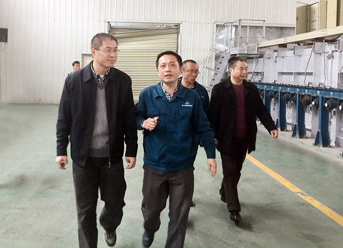 圖為周犇(左一)在浮法玻璃廠聯(lián)合車間實地檢查。