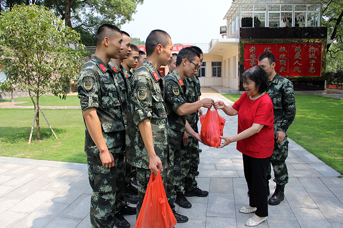 “我是一個兵,來自老百姓……我是一個兵,愛國愛人民。”嘹亮、高亢的歌聲在武警萍鄉(xiāng)中隊(duì)大院響徹云霄,被戰(zhàn)士們稱為“兵媽媽”的陶艷萍正打著節(jié)拍,和官兵們一起歡快地演唱《我是一個兵》,將一片濃濃的“端午”情帶進(jìn)軍營。” 每逢節(jié)假日,年逾古稀的陶艷萍就忙碌起來,奔走各軍營看望慰問官兵戰(zhàn)士。今年端午將至,6月14日她剛從武警上栗中隊(duì)回來,15日又趕往武警萍鄉(xiāng)中隊(duì),為戰(zhàn)士們送上自己親手包的粽子,與戰(zhàn)士們提前過端午節(jié)。 武警萍鄉(xiāng)中隊(duì)的戰(zhàn)士們吃著粽子,心情非常激動,他們說陶媽媽經(jīng)常來軍營慰問,對他們無微不至的關(guān)懷,讓大家感受到家一般的溫暖,她幾十年一如既往對擁軍工作的支持讓他們非常感動。每逢此時,陶艷萍總是笑著說:“戰(zhàn)士們遠(yuǎn)離家鄉(xiāng)和親人,最需要的是家庭般的溫暖,我只是做了應(yīng)該做的,官兵們心里惦記著我,這讓我真正體會到了‘軍民一家親’。 在武警萍鄉(xiāng)中隊(duì),“兵媽媽”先后參觀了軍營的文化室、班排宿舍,與戰(zhàn)士們親切交談,并關(guān)切地詢問他們的生活、訓(xùn)練等方面情況,希望他們發(fā)揚(yáng)一不怕苦,二不怕累的優(yōu)良傳統(tǒng),成為一支打勝仗的部隊(duì)。據(jù)悉,陶艷萍明天還要前往萍鄉(xiāng)市公安消防支隊(duì)躍進(jìn)大隊(duì)安源中隊(duì)進(jìn)行慰問。