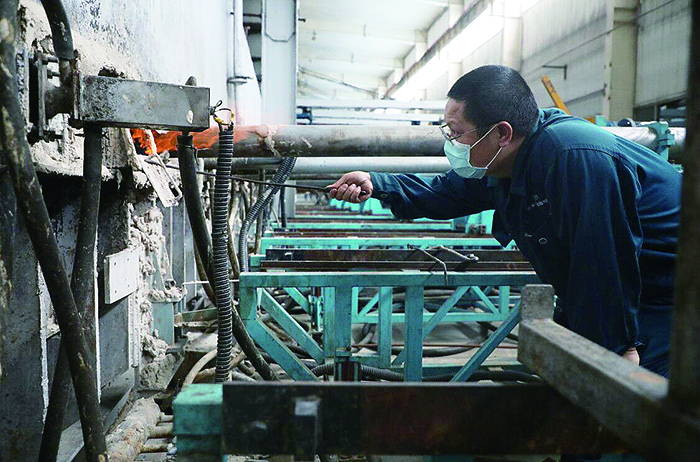堅(jiān)毅——熱浪撲面而來,高溫炙烤全身。在浮法玻璃廠,職工們用堅(jiān)韌不拔的毅力抵抗高溫的侵蝕,汗水打濕了他們一件又一件衣服,臉被烤得通紅,他們卻從不退縮。一塊塊玻璃在他們的努力下,被制作出來送往千家萬戶,為人們遮風(fēng)擋雨。他們是堅(jiān)毅的浮玻人,他們?yōu)閵^斗而生。圖為錫槽工觀察窯內(nèi)火焰狀況。