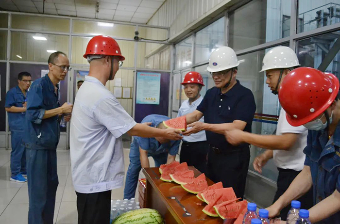 炎炎夏日,驕陽似火,本周萍鄉(xiāng)氣溫更是高達(dá)39℃,到處都像一個(gè)大火爐。面對(duì)這種極端高溫天氣,萍礦集團(tuán)除持續(xù)做好安全督查外,高度重視生產(chǎn)現(xiàn)場(chǎng)的防暑降溫,全面開展“送清涼”活動(dòng)。7月26日下午,萍礦集團(tuán)黨委副書記、總經(jīng)理劉智明,副總經(jīng)理江錫兵一行即深入浮法玻璃廠,為生產(chǎn)一線職工送去企業(yè)關(guān)愛,也送去絲絲“清涼”。 “大家辛苦了!現(xiàn)在天氣炎熱,大家一定要注意安全、保重身體!”走進(jìn)浮法玻璃廠調(diào)度室,劉智明看望了在高溫酷暑中堅(jiān)守崗位、辛勤工作的一線職工,為他們送上了西瓜、涼茶、礦泉水等防暑降溫物資,關(guān)切的問候也讓大家心頭一暖。 從調(diào)度室到窯頭,劉智明一行邊走邊看,了解職工的勞動(dòng)強(qiáng)度、作業(yè)環(huán)境,以及當(dāng)天的生產(chǎn)、安全情況?吹杰囬g內(nèi)的溫度計(jì)顯示溫度已達(dá)62℃,劉智明強(qiáng)調(diào),要多關(guān)心職工的工作、生活,結(jié)合實(shí)際精心做好防暑降溫工作,確保安全生產(chǎn)、安全度夏。 針對(duì)企業(yè)生產(chǎn)經(jīng)營(yíng)和黨的建設(shè)等方面工作,劉智明強(qiáng)調(diào),要緊盯目前市場(chǎng)變化,進(jìn)一步強(qiáng)化產(chǎn)品銷售,在降低庫(kù)存的同時(shí),爭(zhēng)取銷售價(jià)格最大化;要切實(shí)抓好成本管理,把好原料、燃料進(jìn)口關(guān),在確保安全環(huán)保和產(chǎn)品質(zhì)量的前提下,通過科學(xué)調(diào)整拉引量等,降低產(chǎn)量、減降成本;面對(duì)當(dāng)前嚴(yán)峻的經(jīng)營(yíng)形勢(shì),全廠上下都要真正樹立過“緊日子”思想,各方面都要精打細(xì)算,嚴(yán)格控制各項(xiàng)費(fèi)用;要切實(shí)加強(qiáng)領(lǐng)導(dǎo)班子建設(shè),班子成員要不斷提高履職能力,對(duì)分管的工作要盡職盡責(zé),形成工作合力,狠抓各項(xiàng)任務(wù)落實(shí);要以巡察整改為契機(jī),牢固樹立政治意識(shí)和規(guī)矩意識(shí),嚴(yán)格招投標(biāo)程序,提高工作透明度,實(shí)現(xiàn)規(guī)范化運(yùn)作,確保在采購(gòu)供應(yīng)上不出任何問題。