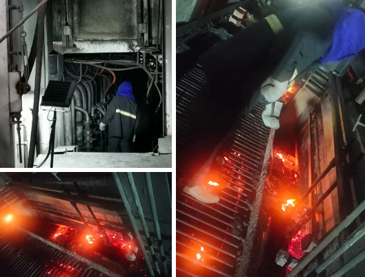 磚材找到了,但是操作空間小、溫度高,怎么辦?熱補當日,在臨時采取壓火風機壓火的輔助下,他們首先做好臨時吊磚裝置,并用鋼夾吊好磚,磚重60斤,戴上鋼夾后重達150斤。然后林萍、陳勇新帶領2名保窯工身著專業(yè)防火服,來到熔洞上方進行熱補。站在熔洞口,雖然是專業(yè)人員,但直射出來的火焰一點也“不留情面”,他們即刻就全身汗?jié),整個人就像在“煉丹爐”里炙烤,堅持不了10分鐘就得換人。為爭取時間,他們動作麻利、行動迅速,待殘磚處理干凈,迅速通過簡易吊裝裝置將替補磚材輸送到精準部位對接,再用熱補料進行密封。整個操作順暢連貫、一氣呵成,一天內(nèi)就熱補到位,也沒影響產(chǎn)質量!暗浆F(xiàn)在為止,熱補已經(jīng)7個月了,效果非常好,未發(fā)生透火現(xiàn)象,而且節(jié)約了不少資金!绷制几嬖V記者。該項目也在萍礦集團2022年度“五小”活動中獲得一等獎。