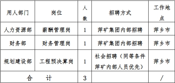 因工作需要,萍礦集團(tuán)公司招聘薪酬管理崗、財務(wù)管理崗、工程預(yù)決算崗各1人,現(xiàn)將有關(guān)事項公告如下:
