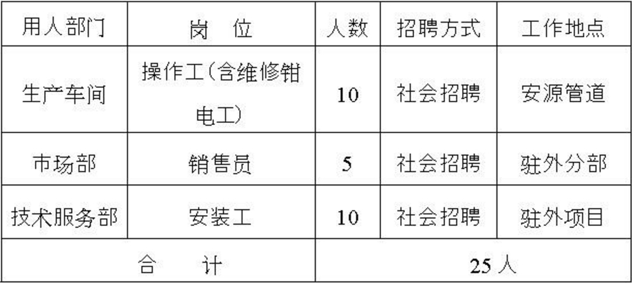因工作需要,現(xiàn)面向社會公開招聘安源管道實業(yè)股份有限公司操作等崗位人員25名,有關事項公告如下: