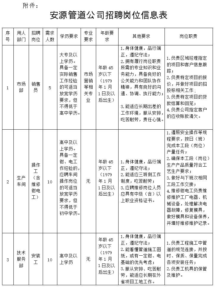 招聘崗位所需的具體條件詳見《安源管道公司招聘崗位信息表》
