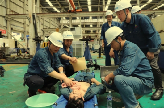 此次演練重點圍繞在高溫下的車間作業(yè)過程中如何預(yù)防和處置中暑,模擬生產(chǎn)車間操作工在作業(yè)過程中中暑暈倒,發(fā)現(xiàn)險情后,應(yīng)急小組人員迅速啟動應(yīng)急預(yù)案,各組人員各就各位、各司其職,迅速將中暑人員轉(zhuǎn)移至安全地帶,經(jīng)過人工物理降溫、喂服防暑藥品等緊急處置,中暑人員逐步恢復(fù)意識,脫離危險,并通知救護車送往就近醫(yī)院接受救治的全過程。