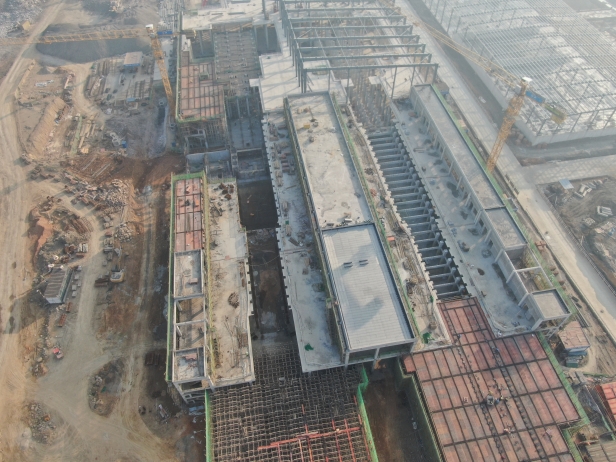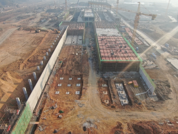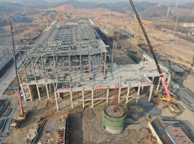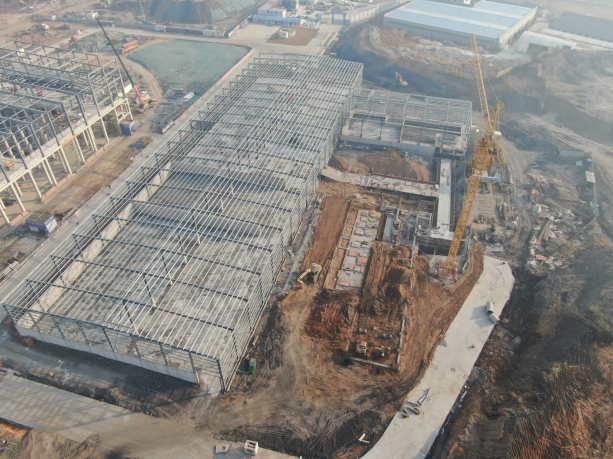 綜合原料庫:基礎(chǔ)工程完成100%,鋼結(jié)構(gòu)吊裝完成97%,主體工程完成38%。 原料車間:基礎(chǔ)工程完成98%。