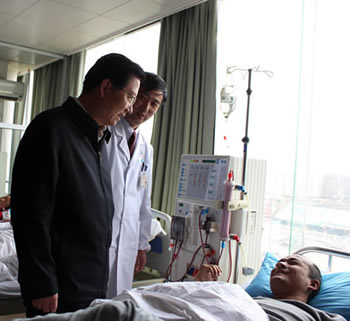 2013年4月2日,省委書記強衛(wèi)(左一)到湘雅萍礦合作醫(yī)院調研。 | 2009年11月23日,江西省委副書記王憲魁、省政府副省長熊盛文一行,來到安源煤礦看望慰問全國勞模王湘萍,并向萍礦廣大職工致以節(jié)日的問候。