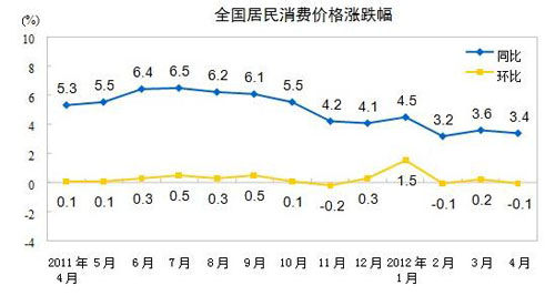 國(guó)家統(tǒng)計(jì)局今日(11日)公布的數(shù)據(jù)顯示,2012年4月份,全國(guó)居民消費(fèi)價(jià)格總水平同比上漲3.4%。