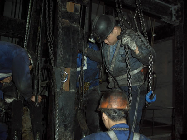 巨源煤業(yè)公司立井摩擦輪絞車主提升鋼絲繩是礦井生產(chǎn)中的重要運(yùn)輸工具,為四根6×25Fi型鋼絲繩,每根長度為300米,按《煤礦安全規(guī)程》規(guī)定已接近服務(wù)最大年限。為確保提升系統(tǒng)安全,保證礦井的正常生產(chǎn),近日,機(jī)電科挑選精兵強(qiáng)將對該鋼絲繩進(jìn)行更換。經(jīng)過兩天的奮戰(zhàn),他們將四根新提升鋼絲繩成功安裝到立井提升系統(tǒng),更換工作提前保質(zhì)保量順利完成。圖為技術(shù)人員正在立井緊張施工。