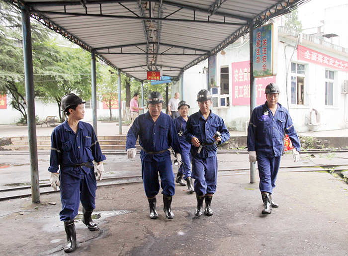 圖為彭群倫(左二)率隊(duì)深入白源煤礦井下進(jìn)行現(xiàn)場檢查 6月20日起,萍…